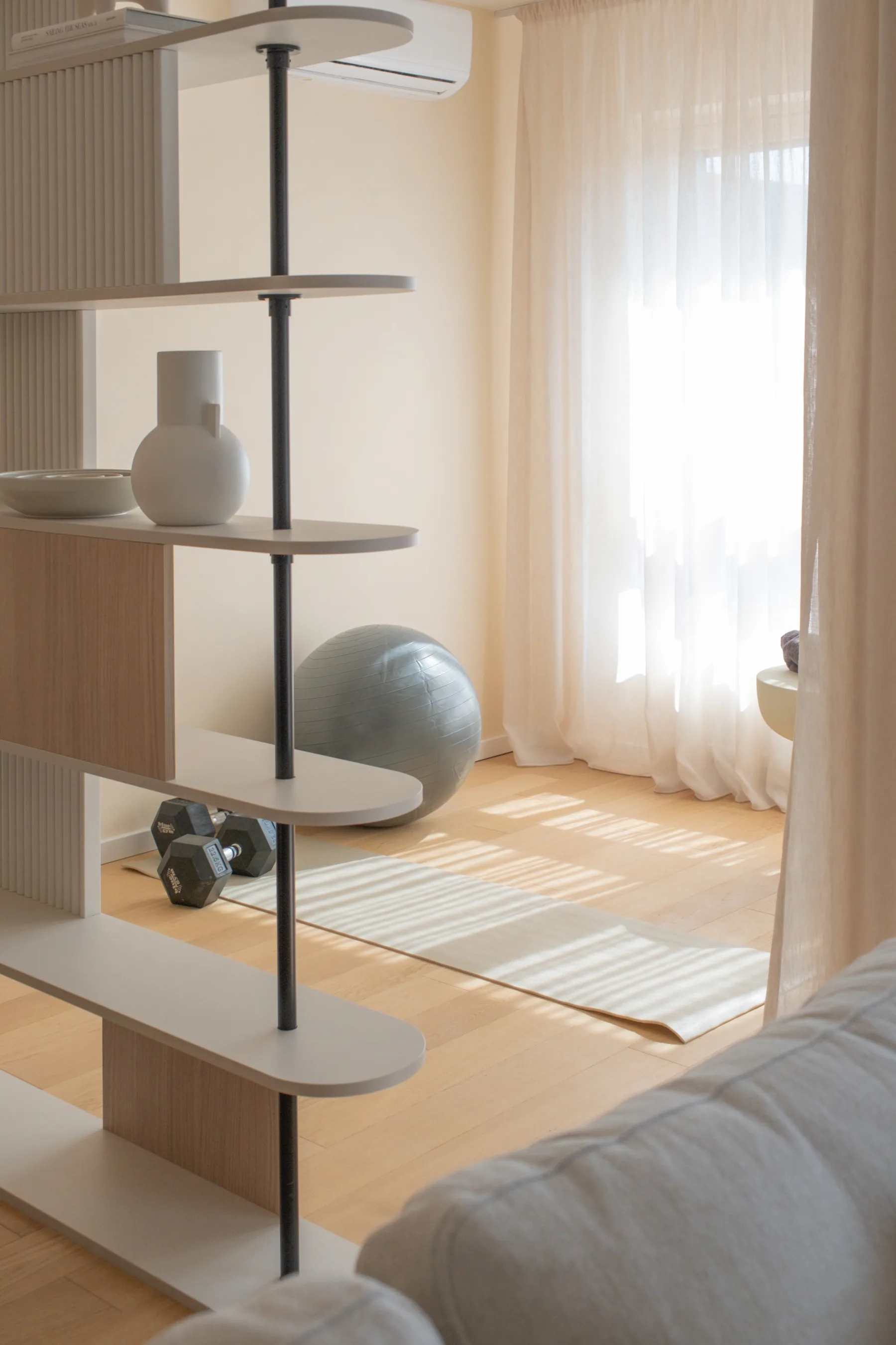 The home gym, an important part of the owner’s daily routine, is discreetly integrated into the open-plan space. A custom-designed shelving unit provides visual separation and privacy during use, while maintaining the flow and harmony of the interior.