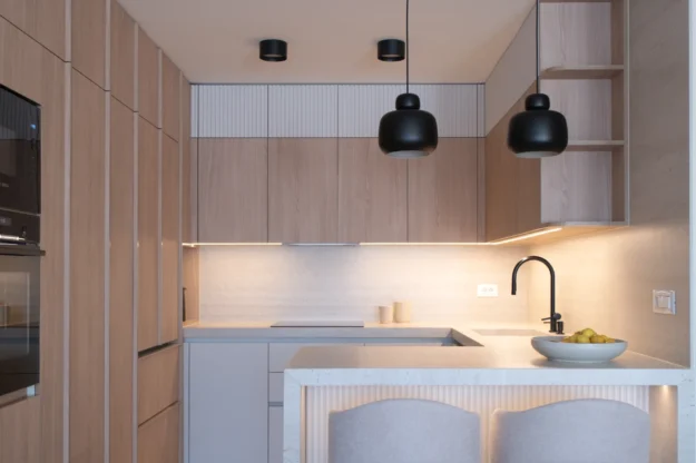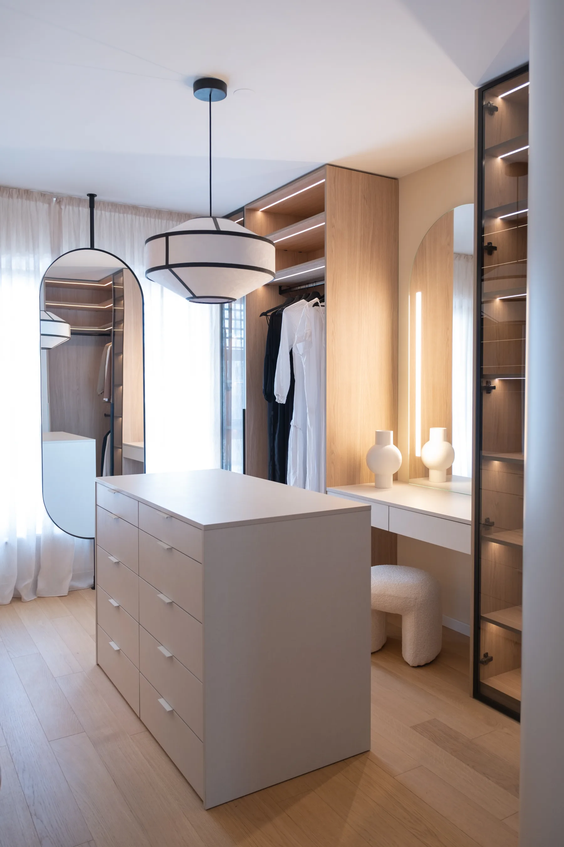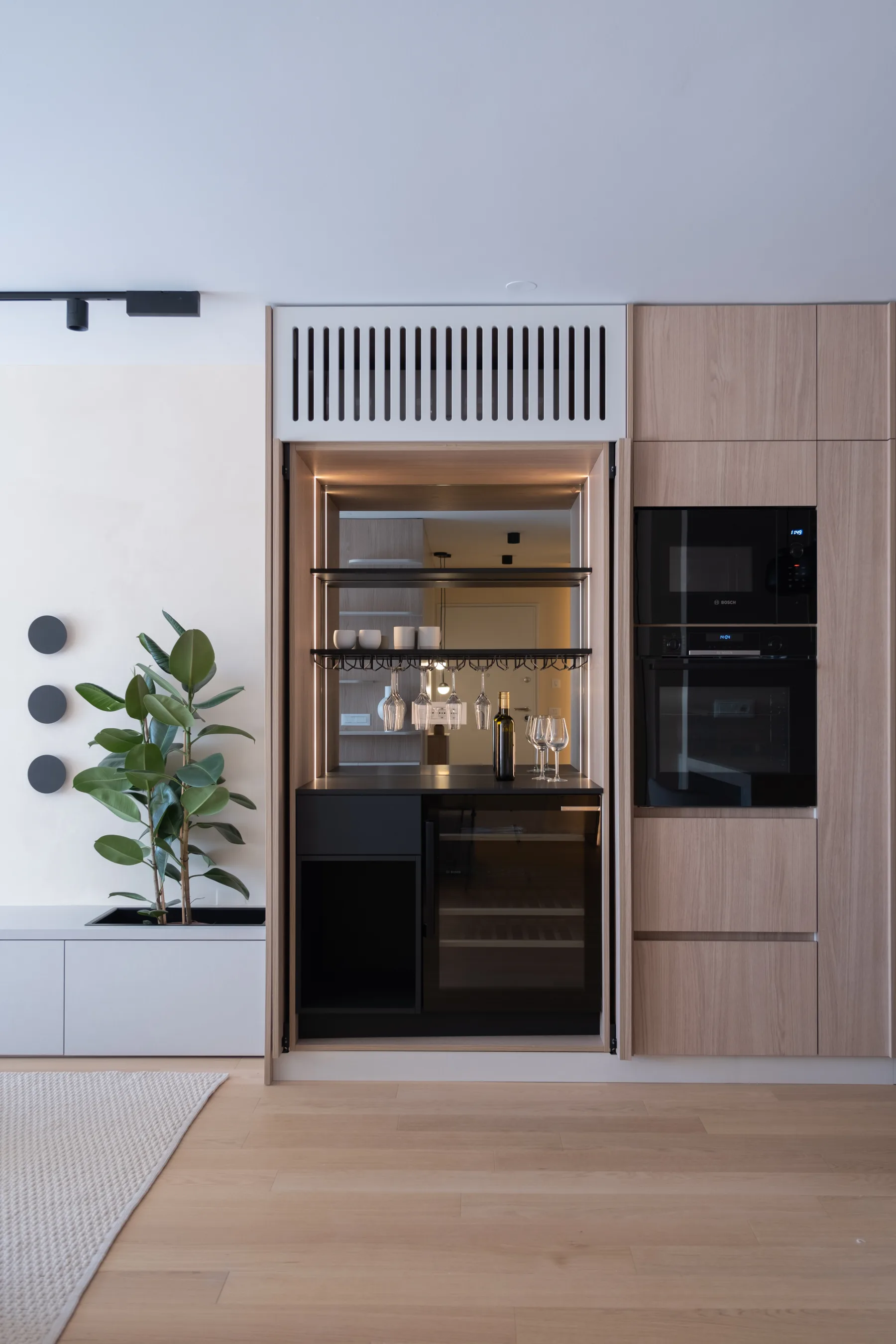 Custom furniture and concealed functional solutions further emphasise the balance between aesthetics and practicality, creating a home that is at once elegant, serene, and adapted to real living habits.