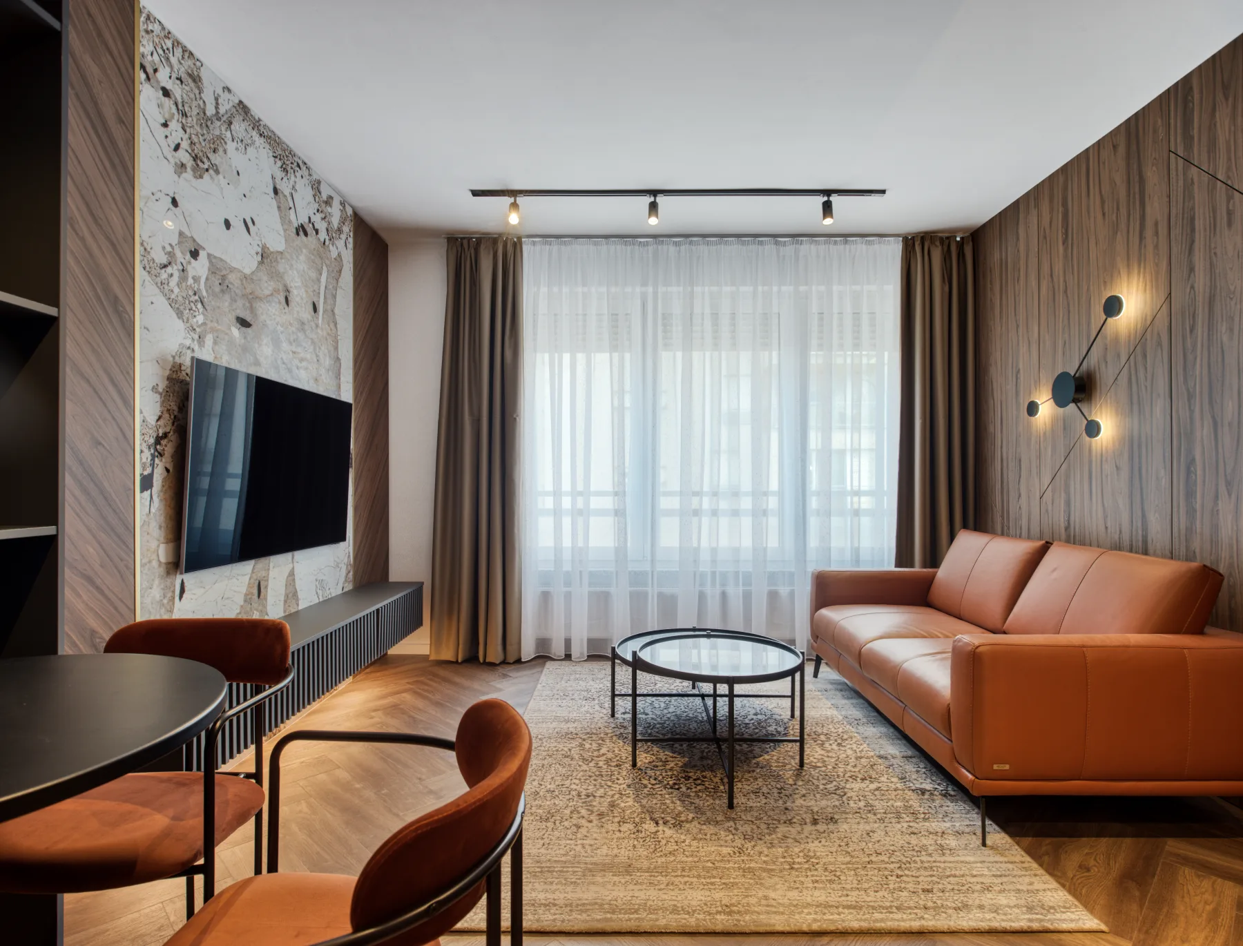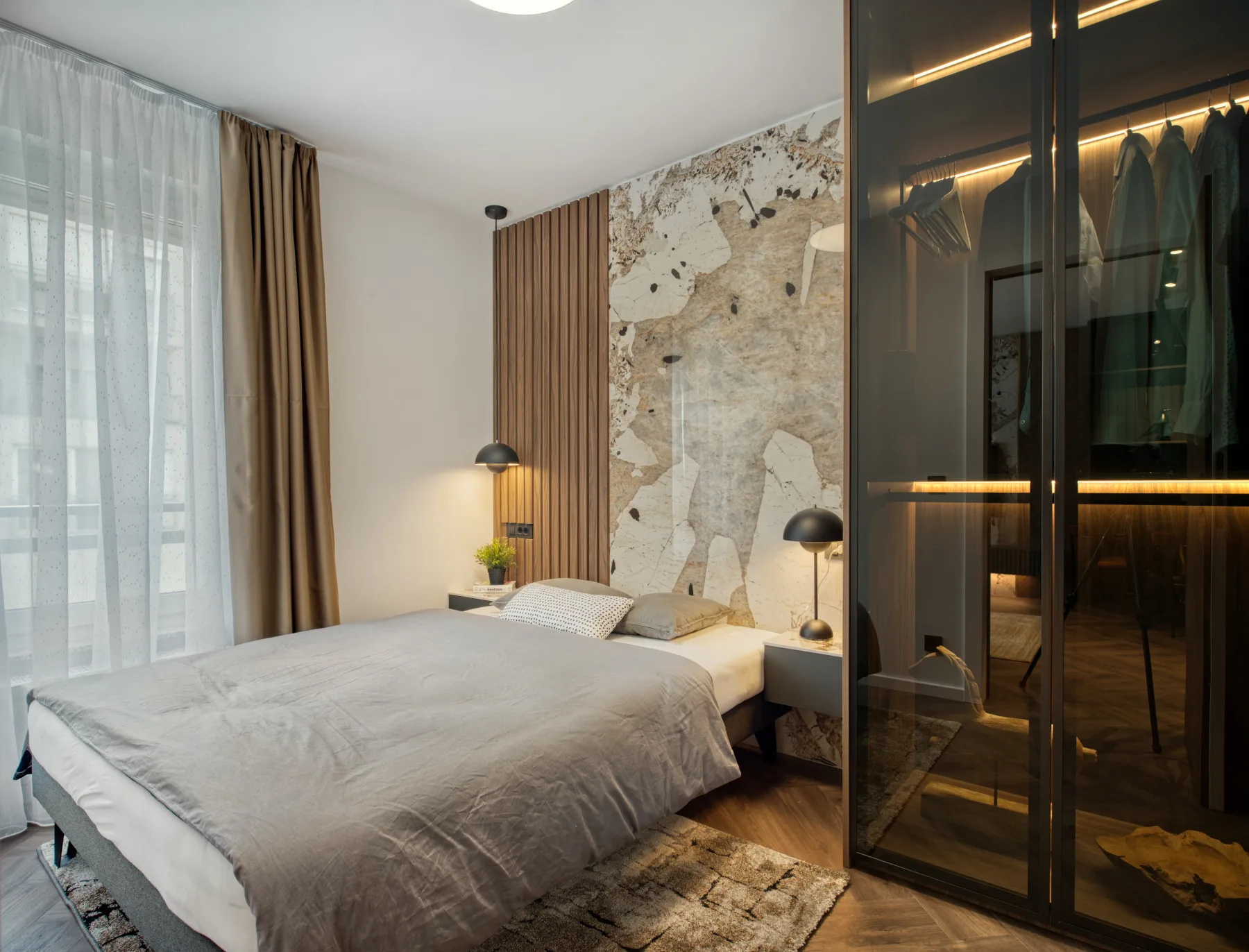 Custom furniture enabled efficient space organisation and integration of all necessary functions without visual clutter. Lighting and materials further emphasise the depth and character of the space, creating a sophisticated and contemporary ambience.